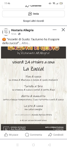 Siamo stati all’Hosteria Ristorante All’Allegria di Udine per festeggiare un compleanno in compagnia, e non possiamo che parlarne benissimo! Eravamo in dieci, accolti in un ambiente spazioso, curato e davvero accogliente, perfetto per stare bene insieme e godersi la serata. Il personale è stato gentilissimo e attento fin dal primo momento, con sorrisi sinceri e un servizio impeccabile. La paella era abbondante e ricchissima di sapori, con ingredienti freschi e ben bilanciati, mentre la sangria ci ha conquistati con il suo profumo fruttato e il gusto vivace, perfetta per brindare in allegria. L’atmosfera del locale è calda, con quel tocco di storia che si respira nei dettagli. Ottimo anche il rapporto qualità-prezzo. Se cercate un posto dove sentirvi a casa ma con un tocco di classe, All’Allegria è una scelta che non delude. Torneremo sicuramente!...