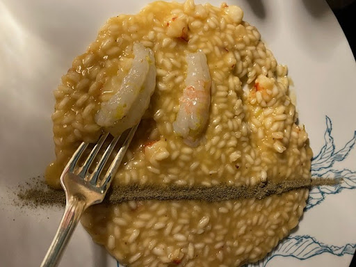 In der Hoffnung, dass die Spezialität des Hauses noch schmecken wird, waren wir noch nicht allzu enttäuscht (das Brot im Körbchen schmeckte gut, und so war das Warten erträglicher), doch dann kam die pure Enttäuschung: das schlechteste Risotto, das wir je gegessen haben. Nicht nur, dass der Reis nicht gar war – und ich rede nicht von „al dente!“ hier, denn „al dente“ kochen ist die Voraussetzung für ein gutes Risotto (Man sieht auf dem Foto, dass der Reis nicht al dente ist, sondern immer noch roh!). Das Risotto aus dem einst guten Restaurant „Vitello d’Oro“ war roh, wässrig und nicht cremig, mit zwei oder drei winzigen Stückchen Scampi und drei rohen aufgelegten Scampi-Stücken, dekoriert mit einer dicken Pfeffer-Linie. Die Risotto-Menge hätte vielleicht 2-3 Esslöffel gefüllt, und die Scampi waren unsauber geschnitten und nicht ordentlich herausgenommen. Die Pfefferlinie bestand aus Pfeffer und Kräutern – und ruinierte das wenige Aroma des Risottos! Wir konnten das Risotto auch nicht essen, also verlangten wir die Rechnung und verließen das Restaurant ohne Dessert.