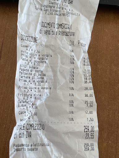 Ho pubblicato lo scontrino non perché il prezzo è eccessivo. Siamo nella media del posto e del periodo. E la qualità del mangiare è alta. Non posso dire lo stesso del servizio. Arrivati alle 8.30 come da prenotazione. Ordinazione presa alle 9 (non è chiaro perché è stata presa l’ordinazione di altri tavoli arrivati dopo). Antipasti serviti alle 9.30. Un ora. Con 5 bambini che facevamo fatica a tenere ed una persona disabile di 81 anni. Verso le 9.20 sono andato a chiedere a che punto stavano gli antipasti: mi hanno attaccato in due con metodo intimidatorio dicendomi che era solo 25 minuti che aspettavo perché la comanda era stata presa alle 9 (cosa vera ma noi eravamo seduti dalle 8.30). Mi hanno preso in giro dicendomi che mi stavo lamentando senza motivo solo perché mi avevano dato un tavolo sul retro (cosa vera, in effetti la mattina avevo telefonato chiedendo la cortesia si avere un tavolo vista mare perché in questo modo avremmo fatto godere un po’ del mare alla persona disabile, quindi si ci ero rimasto male vedendomi posizionato sulle retrovie). Il servizio è stato terribile e il proprietario arrogante al limite della intimidazione. Relativamente alla cena: i bambini sono stati serviti per ultimi, abbiamo chiesto il sale perché la pasta era senza mai portato, abbiamo chiesto il formaggio per la pasta al pomodoro, siamo dovuti andarlo a prendere in cucina, malgrado richiesto non sono mai stati portati i piattini per le conchiglie, etc. Purtroppo quando si inizia una attività senza averne l’esperienza e la capacita questi sono i risultati. Mi aspetto una risposta dello stesso livello di educazione. Me ne farò una ragione. Educatamente a fine serata abbiamo ringraziato, abbiamo pagato il dovuto e non torneremo mai più’. Peccato, il posto è meraviglioso, rovinato dalla...