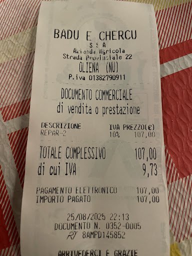 Read moreOggi sono stato con i miei amici di Genova in questo posto fantastico la quale mi avevano parlato varie persone rimaste soddisfattissime. Arrivati sul posto siamo rimasti estasiati, non solo per il luogo ma per il calore dell'ambiente che si e' creato fin da subito col personale e con Sandro. Il mangiare è stato strepitoso, dalla pecora in umido preparata alla perfezione fino alla trippa, il cinghiale in umido e per poi deliziarci con un ottimo porcetto arrosto cotto alla perfezione e carni di altissima qualità, tutto squisito accompagnato da un' ottimo vino Cannonau Nepente di loro produzione che tra l'altro ad un prezzo davvero ridicolo 16€ a bottiglia contro i prezzi che si vedono in giro a circa dai 20/25 €. Le prime portate anch'esse eccezionali, da incanto i maloreddus e i maccarones. Per non parlare delle squisite seadas che come qui non le ho mai mangiate da nessuna parte , Il tutto condito dall'ottima compagnia di tutti. I miei amici, come me sono rimasti entusiasti di questo luogo. Ci ritorneremo sicuramente e inoltre lo consiglio a tutti, posto ideale per famiglie con bambini dove deliziarsi dei veri sapori della Sardegna. E volendo abbiamo scoperto la presenza di una bellissima suite accogliente. 5...