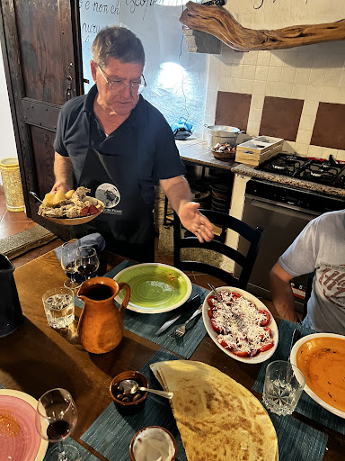 A unique experience! An evening in Oleina. We went by chance, without a reservation. They took pity on us and welcomed us to their table. We were incredibly lucky! We ended up in a room with beautiful and traditional furniture and painted walls, with a huge table and 16 chairs. There were only four seats available. We sat down and they explained to us that the food was shared between all of us. It is prepared by the owners and everyone is served the same food. we started with the local bread - pane carasau, focaccia with a printed flower, two types of cheese and olives. We continued with meat delicacies and cheeses. Several dishes followed - a vegetable pie, a dish of wild fennel, chicory and potatoes and another dish - with tomatoes, peppers and eggs. This was followed by freshly prepared gnocchi with tomato sauce, prepared by our host's father-in-law. Then we were offered goat meat prepared according to a local recipe and the typical Sardinian roast pork - porcedu. We were offered the specialty of Sardinia - a mature cheese with worms, eaten spread on their bread and figs. We were served dessert by asking everyone what they wanted - semifreddo with different flavors as well as their dessert Saeda - fried in pizza dough cheese drizzled with honey. Finally, they offered us different types of liqueurs - with myrtle, pomegranate, anise, peach and grappa. The owner told us about the recipes, when they were prepared and the dates of the recipes, what they were made of. He read us poetry. Everything was abundantly poured with the typical and special for the region red wine - nepente. A unique and...
