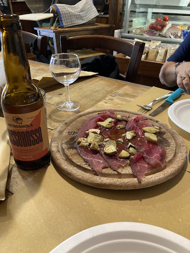 In giro per castelnovo di garfagnana ci fermiamo in questa TEORICAMENTE "osteria", ribadisco TEORICAMENTE perchè non lo è!!! Se si mette un cartello con scritto "OSTERIA" si presuppone che ci siano dei pasti caldi, o almeno, in tutte le osterie dove siamo stati almeno un primo caldo ci è stato sempre offerto. Abbiamo per prima cosa aspettato mezz'ora prima di poterci sedere, nonostante ci fosse già il tavolo disponibile, ma andava sparecchiato e nessuno lo faceva. Servizio parecchio disorganizzato, accumulavano tutti i piatti sporchi su altri tavoli e facevano aspettare le persone in piedi per parecchio tempo nonostante i posti fossero presenti e disponibili. Ci siamo seduti e ci è stato detto che ci portavano un po' di misto crostini saluti e cose così, e noi eravamo TUTTI convinti che fosse una specie di antipasto, poi mi è venuto il dubbio perchè non avevo visto passare nessun piatto caldo, allora ho chiesto "ma fate anche primi?" la risposta è stata "no perchè non abbiamo la cucina", se l'avessimo saputo fin da subito di certo non ci saremmo neanche seduti. Ci è stato portato un piattino di farro (che se non avete la cucina dove l'avete cotto??? a casa?? e le norme igieniche? va beh.....), dei crostini (.....), dei formaggi (che sopra uno c'era un pelo....), dei salumi (che abbiamo praticamente lasciato li, li abbiamo assaggiati ma mi dispiace sapevano di conservato male, infatti io sono dovuta correre in bagno.....non siamo stati gli unici fra i tavoli comunque ), il tutto a 23 € a testa (eravamo in 4) con 2 bottiglie d'acqua, 1 birra in bottiglia e 2 bicchieri di vino (non c'era il mezzo litro, ci hanno portato la bottiglia e ho dovuto portare al bancone quanto vino avevamo bevuto). Prezzo davvero assurdo!!!!!!!!!!!!!!!!!! Io mi domando come fa ad avere 4stelle e mezzo, sono stata in posti di gran lunga peggiori ma che ho mangiato molto meglio e non sono dovuta...
