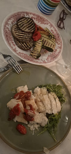 Personalmente ho preso la tagliata di pollo con rucola , grana e pomodorini confit e come contorni verdure grigliate e patate al forno. Pollo morbido e pomodorini gustosi. Verdure e patate molto buone.