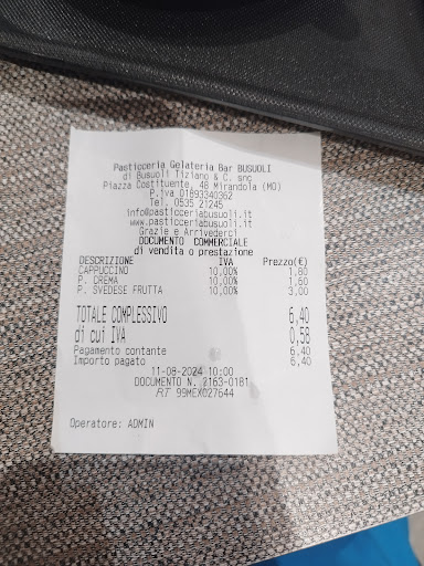 Grazie per avermi rovinato la domenica !! Lavoro 6/7 e oggi essendo di riposo decido di fare un lungo giro in bici partendo da Modena. Arrivo per fare colazione , entro e nessuno ricambia il saluto , ma ci può stare perché stavano lavorando e magari non sempre sentono , quello che non ci può stare è tutto il resto. Ordino un cappuccino una svedese con la frutta , ed una brioche alla crema e pago 6.40 , caro? Non lo so e nemmeno mi interessa , quello che mi interessa è che i prezzi fossero scritti cosa che non lo erano ,ed i prezzi devono essere esposti sul lato della cassa dove ordini altrimenti viene tutto a caso , ma questo è il meno e cmq sono in linea con il resto dei bar forse qualche centesimo in più ma nulla di che. Pago con la carta e nemmeno era uscito lo scontrino del pos che già prendeva la comanda di quella dopo di me . Sento che dice qualcosa a qualcuno e quindi deduco che la roba mi venga poi servita o vengo chiamato. NESSUNA RICEVUTA MI È STATA DATA , NEANCHE QUELLA DEL POS. vabbè mi siedo attendo 4 minuti e non vedo che la mia roba arriva , quindi mi alzo e chiedo alla stessa signora notizie e lei mi dice che la roba la stavano preparando !! Benissimo ma io che ne so ?? Io come faccio a Sapere chi mi deve dare la roba senza una ricevuta né nulla ? Lei mi dice che era già stato detto al bar e che la roba sarebbe stata pronta , e guarda caso era pronta sul bancone senza che nessuno mi dicesse nulla !! Tanto è vero che mi ha chiesto pure cosa avessi ordinato. NON SAREBBE PIÙ SEMPLICE DARE LE RICEVUTE E FARNE 2 ? AH GIÀ CHE LA CARTA COSTA SCUSATE. Cioè uno ordina e non si sa come si faccia a ritirare la roba , tanto è vero che era ferma sul bancone senza che nessuno dicesse nulla. Ora arriviamo al resto, brioche alla crema e svedese alla frutta ottime ( quindi non critico a caso) e la crema è una delle più buone mai assaggiate a ben bilanciate, cappuccino al pari delle macchinette, era imbarazzante. Ah il bicchierino d' acqua è stato dato a tutti ma a me no, sicuramente è stata una dimenticanza ma si può aggiungere al resto della disorganizzazione. Dal 1966 e non hanno capito che hanno inventato i numeri o gli scontrini per ritirare la roba , specialmente quando ci sta molta gente . Quello che per loro è scontato non lo è per chi non frequenta il bar . Già che non fai il servizio al tavolo , vuoi almeno organizzarti per farmi ritirare la roba facilmente ?? Mah. Ah lo scontrino era sul vassoio quando poi l' ho ritirato, infatti non sto discutendo che non sia stato fatto lo scontrino ma le modalità del servizio che sono imbarazzanti. Ah vabbè lo scontrino del pos se lo sono tenuti. Nemmeno gratis tornerei mai in un posto simile. Allego lo scontrino perché poi dicono " non ci risulta che tu sia venuto " o altre...
