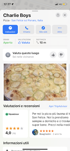 Read moreLa classica pizza di Charlie è sempre buona, sottile e croccante. La pizza viene condita abbastanza abbondantemente ed ha un prezzo ragionevole, (per esempio una Margherita è 4€) con 1€ in più per ogni altro ingrediente aggiunto. Mangiare lì o prendere da asporto? Tutto...