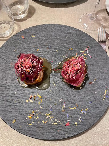 Read moreCasual elegance prevails and it is obvious how much the owner and chef care about the food and service they present. The chef came to the table to see if we had any questions about the menu and when I ordered the pork tenderloin he personally came out to discuss how I would like the meat cooked. We settled on pink but not bloody and it was perfect and full of flavor. The chef's creations are creative but still using local products with an interesting take on traditional Tuscan dishes. The chef reminds me of our experience in 2006 at Modena's La Francescana with Massimo Battura who is now a 3 star Michelin Chef. A modern take on tradition without straying too far away (Battura has been accused of straying). At Le Ginestra we ordered an appetizer of tempura fried pecarino cheese, the cheese wrapped in a very thin slice of pig cheek similar to bacon, battered, fried and served with a fig musk (sauce). We were told this is the chef's take on sushi. OH did I mention the hand made, creamy and delicious chocolate/orange gelato served in a waffle cup for dessert? If you are anywhere near Radicofani, you must try this...
