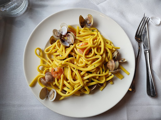 Food was served in a nice way, fair portions. Good choice of different things, fish and meat, nicely looking starter of mixed sea food. Annotations in the menu regarding frozen products or their availability were confusing. Indeed, taking scialatielli with shrimps and clams should contain only fresh sea food but shrimps were definitely frozen, tough and tasteless. The starter with shrimps in mayonnaise was tiring. There was a family gathering in the same room so it was too loud. I would like to give 4.5 as a vote but it is...
