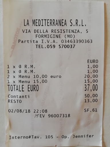 Salve, questa sera;io e mia figlia abbiamo deciso di prenderci due belle strie con frittura di pesce alla pizzeria mediterranea.Fin qui nulla di che il bello arriva appena apro le pizze a casa tutte bruciate.Immangiabili come potete vedere dalle foto, convinta da mia figlia chiamo in pizzeria per avvisare dell'accaduto e con gentilezza mi dicono nessun problema signora le rimandiamo altre due pizze guardi non c'è problema.Ormai sono a casa.è non torno a Formigine volevo solo avvisarvi dell'accaduto in modo che la prossima volta non.Accada più non. Si preoccupi lei ha fatto bene se mi dà il suo indirizzo le mando altre due pizze ok ma ne abbiamo assaggiato una fetta non si preoccupi. Non importa ok. Allora va bene. Buona serata nel frattempo le mando le foto via watzap cosi vedete anche voi buona. serata. e grazie .dopo 15 secondi mi richiama tutta che ride nemmeno si capiva cosa stesse sbraitando e capisco solo che devo portargliele ? Scusi cosa devo portarvi? Signora le pizze dovete ridarcele ma certo se mi sono presa la briga di chiamarvi sarà mia cura riconsegnarvi questi due aborti della natura non si preoccupi.ovviamente non Sono i termini da me usati al telefono ma sarà Mia premura scriverli per darvi un idea più precisa.passano 40 minuti si fanno le 22.10 mi avvisano via cell che le pizze. Sono arrivate io mi ero assentata 15 minuti da casa chiamo e avviso di scendere Ma quando torno a casa. Le sorprese non mancano quando apro mi trovo una stria con frittura di pesce e una stria. ??.possibile si siano sbagliati per la seconda Volta.Chiamo e cosa. Mi dicono no signora nessun errore dal momento che le avevate assaggiate il titolare ha detto di portarvi una stria con frittura...