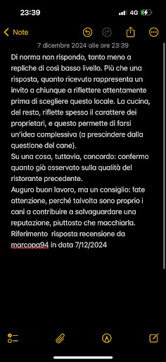 Read morePranzo squisito, abbondate, con alta qualità della carne. La gentilezza e il servizio sono stati incredibili. I miei ospiti hanno preso la tagliata cotta sulla pietra e l'hanno spolverata in un battibaleno(peccato, non ne ho potuto rubare nemmeno un pezzetto)! Ma soprattutto mi ha fatto piacere che NON siano ammessi i cani, perché non mi fa piacere dovermi sopportare peli e odori mentre mangio. L'arroganza dei proprietari che vorrebbero impormi di subire i loro comodi mi lascia esterrefatto. Inoltre visto che dite di volere tanto bene ai vostri cani non pensate che non dovrebbero mai essere portati ai ristoranti, perché si annoiano, soffrono, seduti a forza sotto i tavoli, continuamente brontolati se si muovono? Questo è volergli bene o è solo mettervi...