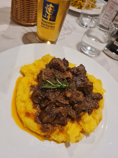 Scelta improvvisata per una pausa pranzo veloce. Entrando siamo stati accolti molto calorosamente dal barista, comunicando che eravano in cinque persone, non avevamo prenotato ed erano oltretutto le 14:30. Molto tranquillamente, subito dopo aver reagito alla richiesta in modo simpatico, ci ha accompagnati al tavolo mentre nel frattempo le cameriere univano i tavoli e lo apparecchiavano. Abbiamo preso un piatto a testa ma io personalmente ho scelto la polenta con lo spezzatino di cinghiale; devo dire ottimo spezzatino e ottima polenta avrei allungato la cottura dello spezzatino personalmente e se posso dare un consiglio alla cucina di tagliare i pezzi tutti uguali, così la cottura risulterà maggiormente omogenea. Sono rimasto contento della scelta dell'aggiunta insolita delle olive(taggiasche credo), la polenta era perfetta con giusta quantità di acqua burro e nel complesso era un ottimo piatto. Di contorno ho preso le verdure grigliate ma purtroppo quelle erano un po' crude quindi non le ho finite in più volevo condirmele ma non c'era più olio e non me la sono sentita di chiederlo. Ho avuto la possibilità di assaggiare anche un po' di gramigna ed era spaziale. Sono veloci nel servizio, tutti gentili, simpatici, alla mano ma non mancano di professionalità. Mi raccomando la sala con i condimenti e la cucina con le verdure ma per il resto bravi. Consigliato sia per un pranzo veloce o una cena in tranquillità. Non solo per...