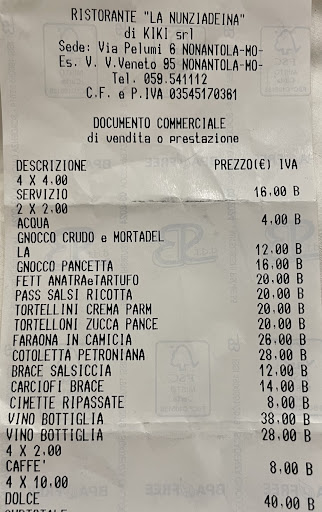 La Nunziadeina e’ un ristorante tradizionale, con cucina di ottimo livello ed un bellissimo locale con camino a vista (dove si cuoce alla brace della bellissima carne). Il servizio e’ professionale ma al contempo cordiale e simpatico, qualita’ non frequente. Abbiamo mangiato in 4 domenica a pranzo ed e’ stata complessivamente una bellissima esperienza. Ogni piatto che abbiamo mangiato, dall’antipasto al dolce, era presentato e cucinato ottimamente con materie prime di ottima qualità. Non si tratta di cucina gourmet, di cucina rivisitata, di cucina fusion, di cucina fronzolata. Sono piatti della tradizione emiliana selezionati e cucinati come si deve. E PERO’, c’e’ un pero’. E il pero’ e’ una speculazione sui prezzi dei piatti che non trova a mio giudizio nessuna giustificazione e che ha, per quanto riguarda me e il mio gruppo di amici e conoscenti a cui consiglierei questo locale, l’unico effetto (PURTROPPO) di non farmi tornare in futuro per una seconda (e terza,quarta,quinta) visita. Vengo ai prezzi a mio giudizio immotivati: Gnocco fritto al crudo 3 euro al pezzo, passi. Gnocco fritto pancetta/parmigiano/balsamico: 8 euro al pezzo, inspiegabile. Primo piatto al tartufo fresco 20 euro, ci sta. Tutti gli altri primi di pasta fresca altrettanti 20 euro, un po’ troppi. Cotoletta petroniana: arriva una porzione (non abbondante, ma Comunque sufficiente) di classica cotoletta alla crema di parmigiano e burro: 28 euro, un furto. La Faraona in camicia, preparazione ben piu lunga e dalle materie prime piu numerose e costose 26 euro, prezzo tutto sommato ok, ma come puo’ costare 28 la cotoletta allora?? Un contorno di 3 MEZZI CARCIOFI alla griglia: 14 euro, follia. Dolci tutti a 10 euro, un pelo troppo anche qua ma amen..