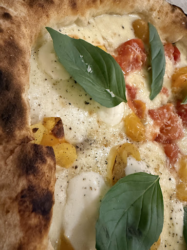 Durante la mia ultima visita, ho trovato un menù completamente rinnovato: pizze contemporanee, realizzate con prodotti di altissima qualità e abbinamenti mai banali. Per l’occasione, ho scelto di concedermi una piccola degustazione, assaggiando diverse pizze preparate con metodi di cottura differenti e processi di lievitazione studiati nei minimi dettagli.