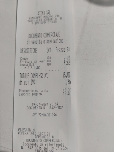 Read moreSarà anche buono ma se fai consegna a domicilio di queste cose, considerato che chi ordina d'aspoorto lo fa per mangiare in hotel o in spiaggia, vanno messe le posate in plastica almeno... La ragazza è inoltre arrivata senza pos e quindi non abbiamo avuto modo di pagare con la carta ma non solo paghiamo con i contanti e a momenti non aveva manco il resto... Le porzioni erano inoltre piccole Risposta Le posate le dovreste mettere perché se dovevo mangiare in spiaggia mangiavo con le mani?? Non deve essere tutto detto dal cliente né per il pos né per le posate. Specifico che la ragazza ha trovato a fatica 50 centesimi ed è stato pagato con una banconota da 20. Abbiamo mangiato in due e la porzione della frittura era poca. Accettate...