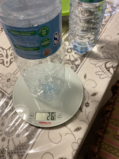 Arrivato a casa ovviamente peso il tutto con una bilancia precisa, (vi allego le foto dei risultati - con confezioni piene e vuote - e della prova con una bottiglia da 1,5 l d’acqua) Sostanzialmente mi hanno dato 1,150g invece di 1500 temendosi più di 10 € di prodotto pagato (32 euro al chilo che quindi diventano più di 40) prendendomi anche per i fondelli.
