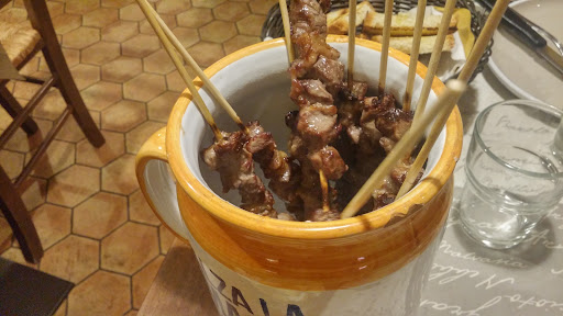 Prenotazione per 15/20 persone Ristorante situato a Tortoreto Alto a 10 min dal lungo mare Sirena di Tortoreto Lido Location meraviglioso , ristorante organizzato su più livelli con terrazze con vista panoramica . C’è posto anche all’interno ma si sconsiglia nei mesi estivi malgrado sia con aria condizionata . Si inizia con un antipasto di salumi e formaggi accompagnati da gnocchetti fritti caldi (ottimi anche con gli arrosticini ) e bruschetta con ventricina ( salame spalmabili tipico abruzzese/ buona ma se ce ne mettessero un po’ di più si apprezzerebbe meglio ) Si prosegue con porzione personale di formaggio fritto ( filante / caldo / pastellatura ottima e non pesante da digerire ) . Io consiglio almeno due pezzi a testa . In fine si arriva agli arrosticini ( tagliati a mano e di fegato con le cipolle ) Magnifici , caldi e su consiglio del camerieri se ne ordinano un tot alla volta in modo da mangiarli sempre caldi . Io personalmente ne ho mangiati 13 normali e 3/4 di fegato . Contorni evitabili e non consigliati specialmente la cicoria . Vino della casa Rosso Montepulciano d’Abruzzo corposo , niente di eccezionale ma accettabile . Si beve anche dell’ottima birra (io vi consiglio la Bianca ) Dolci deliziosi , ho assaggiato la panna cotta alla nutella e la torta casereccia (buona ma ne ho mangiate di meglio fatte in casa ) . Amari buoni ma un po’ industriali . Personale di sala professionale , disponibile e rapido . Sono stato benissimo e ho fruito di un servizio eccellente sia per ciò che ho mangiato sia per l’ambiente piacevole Le uniche pecche sono il parcheggio(per strada gratis ) e la necessità di chiamare con tanto anticipo vista la grande richiesta e numero di prenotazioni Prezzo 37€ a testa Locale visitato...