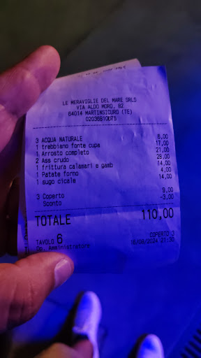 Read moreLe meraviglie del mare e gli orrori del servizio. Ordiniamo due assaggi di crudo ( 5 pezzi diversi), ne arrivano in totale 8. Lo segnaliamo. Dopo più di mezz'ora arriva la portata principale, una grigliata e un primo per mia moglie: "le patate arrivano". Arriva un altro cameriere chiedendo se era per noi un altro crudo ma sto già mangiando la grigliata e in realtà sto aspettando le patate e mia moglie sta mangiando il primo. Poi mi dicono che ce lo manda il cameriere a cui abbiamo segnalato il problema sulla ti pasto. . Dopo un quarto d'ora le patate non sono ancora arrivate mi alzo e vado a pagare: 3 acque invece di due. Meno male mia figlia ha preso solo il fritto ed é arrivato con gli antipasti e quindi ha mangiato in tempi ragionevoli. Al momento di pagare mi chiedono se voglio un caffè o un amaro ma è l'ultima sera della vacanza e volevo concluderà diversamente voglio solo andare via; ringrazio e pago. Il primo cameriere mi chiede come è andata e dopo avergli detto che le patate non sono mai arrivate e he ho pagato un acqua in più dice alla cassiera : dagli 10 euro. Mai più. 2 stelle perché il pesce é buono,...