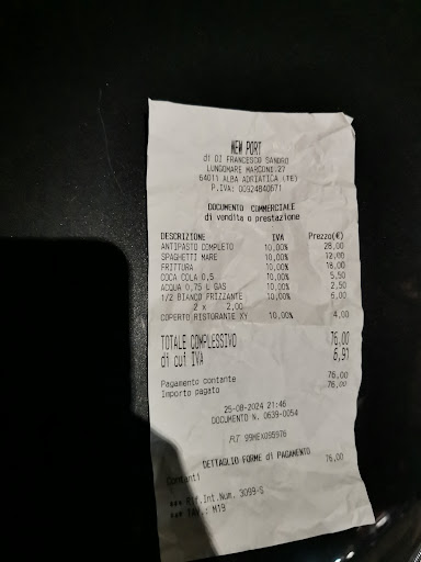 Read moreFrequentato più volte durante il periodo estivo giugno/luglio negli ultimi anni. Abbiamo trovato bicchieri e posate sempre sporchi (di rossetto, di cibo...) e, fatta notare la cosa al cameriere, abbiamo ricevuto ogni volta utensili ugualmente povo lavati. Ieri sera abbiamo deciso di dare al New Port un'ultima possibilità: nel tagliare una delle pizze, però, notiamo fuoriuscire dalla pasta un pezzetto di legno, uno stecchino usato dai cuochi e fatto erroneamente cadere nell'impasto. Inorriditi, ci siamo rivolti a chi di dovere, sentendoci dire con maleducazione e spregio che "può capitare". Unica vittoria, se così possiamo definirla, la pizza in questione ci è stata detratta dal conto. In fin dei conti, la colpa è stata nostra: tuttavia, non commetteremo più lo stesso errore e cesseremo definitivamente di recarci a questo "ristorante" per una...