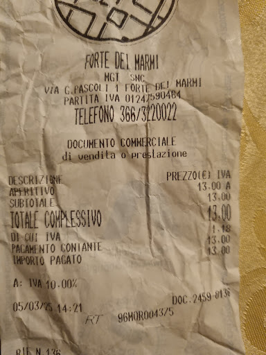 Read moreThe staff lacking of enthusiasm and treated us as tourists very bad because they were nervous, prices very high, obviously searching on internet in 5 minutes were possible to reach other places where prices were really different and nice as well; so they are not only very rude but also thieves. Is this the way you treat tourists? By shouting at them if they change their mind and change pub? Horrible and disgusting. Some people in Forte Dei Marmi told me that is not the first time that this pub treat people so so badly. I still can't believe it. So...