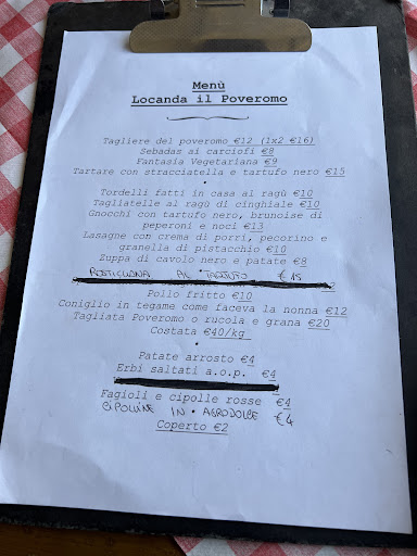 Abbiamo preso: 🧀Tagliere del Poveromo per 4 persone (32€) 🥩Tartare con stracciatella e tartufo nero (15€) 🍚Risotto al Morellino con burrata e nocciole (7€) 🍝Tordelli fatti in casa al ragù (10€) 🍝Ravioli di ortica al pesto di noci (7€) 🥩Tagliata Poveromo (20€) 🍗Pollo fritto (10€) 🥔Patate arrosto (4€) 🍰Dolci: crostata e profiteroles (5€) 🍷Bottiglia di Chianti Superiore (20€)