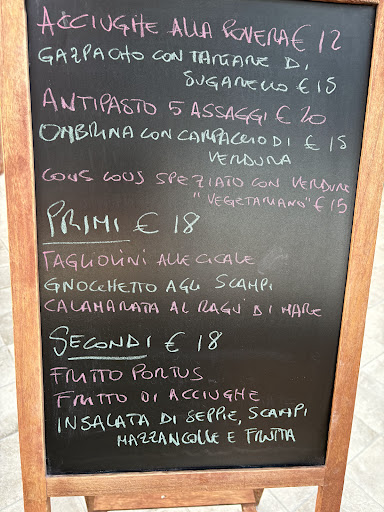 Per quanto riguarda il cibo: eravamo gli unici clienti che cenavano, mentre tutti gli altri prendevano solo un aperitivo. Il menu è molto limitato e, cosa sorprendente per un ristorante con vista mare, non offre nessun tipo di pesce fresco. Allego una foto del menu per chiarezza.