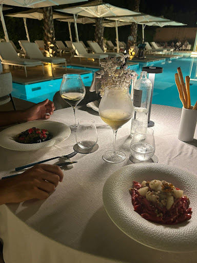 Siamo stati in questo ristorante a Forte dei Marmi davvero incantevole. Un ambiente elegante e tranquillo, con tavoli all'aperto vicino alla piscina, luci soffuse e un'atmosfera rilassante, perfetta per una cena estiva. L'inizio del servizio, però, ha lasciato un po' a desiderare. Dopo esserci seduti e aver consultato il menù, siamo rimasti in attesa a lungo. Solo dopo aver sollevato la questione per la seconda volta, finalmente è arrivata la cameriera per raccogliere l'ordinazione. Il cibo, fortunatamente, ha saputo alzare il livello dell'esperienza. Le tartare di manzo e tonno erano ben fatte e molto buone. I primi piatti anche, ma le fettuccine al nero di seppia sono state davvero eccezionali: mai mangiate di cosi buone Peccato solo per un piccolo inconveniente, ho trovato in bocca un frammento rigido, come uno spillo, probabilmente parte del guscio di un crostaceo. L'ho segnalato con discrezione, la cameriera si è scusata, ma questo inconveniente ha rovinato un po’...