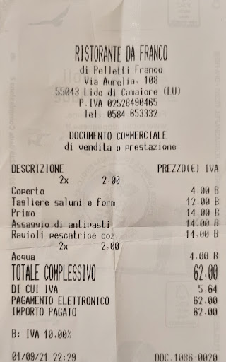 The food is good. But the behavior of the boss and staff is dishonest with passing tourists. We went to eat on a Thursday for lunch and we only had access to the menu, while the Italians all had a choice with the menu of the day, which was much more economical. this behavior is unacceptable because he explained to us that the menu of the day is only for workers and employees, which is totally false and against the law. In all other restaurant since we travel we always could order the menu of the day. I'm sorry but I'm sure that you didn't show us the page of the daily set menu, before we order. Maybe it was a mistake but that's how...