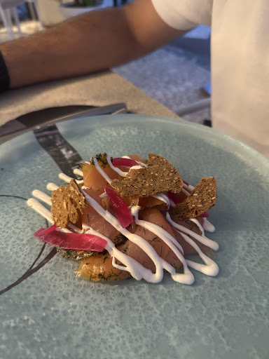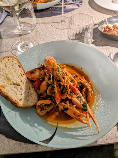 Nice looking place and the vibe is also “elegant”. The food was nothing special. We had the degustation made from the chef with 5 dishes. Smoked salmon (I wasn’t expecting to have this king of food when by the sea in Italy) Shrimps with a sauce (the shrimps were good but basic, the sauce was from a shop or the chef didn’t concentrate much on it) Risotto (this was good and had a very nice flavor) Then we had fish (by far the most dry and least flavory fish I have had in my life. Very disappointing) The desert, like a lemon panna cotta (very good and nice texture)