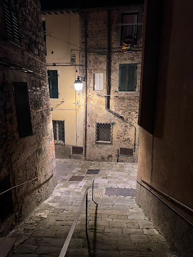 A few blocks walk down a narrow ancient street. We entered the courtyard thru a bar. Then up some stairs. We sat at one of five tables and were waited on by two beautiful Italian women.