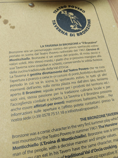 Read moreSono capitato per caso e mi ha entusiasmato cenare alla taverna di "Bronzone" , un locale ricavato dalla cripta della Chiesa dei Santi Leonardo e Cristoforo. Questo è il tipico locale che il turista vorrebbe trovare in ogni luogo, dove la cucina tradizionale è servita all' interno di un locale del 1500, in pratica siete sotto la chiesa. Viene aperta in occasione degli spettacoli estivi del Teatro Povero ed altre occasioni. Trovate specialità della cucina locale (non ci sono i pici), nel menu trovate penne e tagliatelle condite con aglione e ragu di carne tra i primi. Trippa, fagioli e salsiccia, minestra di ceci o fagioli e gli immancabili Cantucci e Vin Santo. Se siete vegetariani l'ampia scelta di piatti senza carne accontenta i vostri gusti. I prezzi sono bassi, qui si spende davvero pochi euro... Andate in questa taverna, non è un ristorante, vi tuffate nella tradizione e questa deve continuare, noi turisti possiamo aiutare queste persone a mantenere aperto tutto l'anno se andiamo a cena. Un difetto lo devo trovare: i piatti sono piuttosto sapidi ma il pane toscano compensa l'eccesso di sale della cucina. Se vi è piaciuta la mia recensione mettete un "Mi Piace " qui sotto e andate a cena alla "Taverna di Bronzone"...