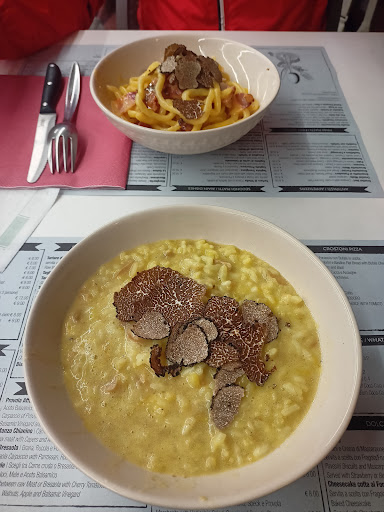 First of all, the food is great. Highly recommend the Scroccazucche antipasti which takes you across the taste palette from great salume to fine bruschetta and good cheese. Then the carpaccio is also high quality: the Chianina one is top notch. The pasta are next level, I had the daily primi which was awesome, the pici cienta and carcioffi are also great. A nice vino nobile along was just perfect. Honest food prepared with love.