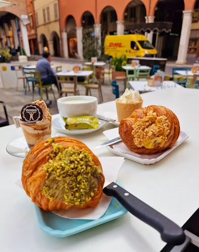 Read moreLocalino molto carino nel centro di Cesena, affacciato in una piazza centrale con numerosi tavolini sia nel dehor che sotto ai portici. Possibilità di stare all'interno del caffè, anche se a mio avviso è più apprezzabile l'esterno. Location in generale accogliente ed elegante. Veniamo al cibo: un paradiso per i golosi come me! Non solo qualche assaggio dei classici prodotti confezionati della nota marca "Babbi" (famosissima x i suoi wafer e simile), ma anche prodotti freschi e artigianali come muffin, brioches, cookies, brownies, bomboloni, biscotti farciti, pancake, waffle e leccornie simili rendono il locale perfetto per una colazione o merenda buonissima e golosa! Onestamente ho visto anche qualcosa di salato (tipo brioches salate) e qualche cliente fare aperitivo, ma sinceramente non ho preso manco in considerazione questo aspetto del locale. Invece sono stata attratta molto dalla sezione "ICE": fanno anche gelato artigianale dall'aspetto molto invitante, sia cono che coppe al cucchiaio; ci sono monoporzioni e bicchierini già pronti di vari tipi e gusti; ed infine dei fantastici sandwich gelato pronti al consumo. La parte caffetteria, inutile anche sottolinearlo, è eccezionale con i loro caffè speciali e cioccolate con loverie varie e topping golosissimi....