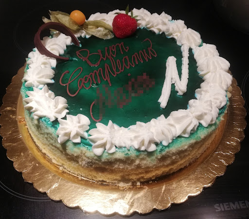 Ho acquistato una torta di compleanno con la speranza che fosse il pezzo forte della mia festa, inutile dire sono stata molto delusa. Mi sono presentata in pasticceria e ho chiesto se ci fosse la possibilità di fare una torta moderna, mi hanno risposto che le fanno continuamente e così ne ho ordinata una dando informazioni precise. Consiglio un corso di aggiornamento per realizzare scritte come vanno di moda ora ossia con il font in stampatello poiché questo è stato sbagliato sulla mia torta, privandola di ciò che io avevo sottolineato di volere. Fortunatamente il sapore questa volta era molto buono e la torta è piaciuta (almeno di gusto). Lascerò la foto di ispirazione che avevo mostrato e ciò che poi mi è stato venduto (ovviamente la scritta che avevo chiesto io non è la stessa della foto di ispirazione perché personalizzata ma il font che doveva essere applicato era quello). Alla fine ho eliminato la scritta fatta dal pasticcere e l’ho rifatta io con la ghiaccia...