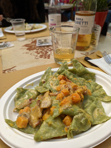 Read moreRosticceria e pasta fresca all'interno del foro annonario. il locale in realtà riserva una bella sorpresa in quanto ha anche qualche tavolo dove poter mangiare quanto preparato dallo staff. L'arredamento è semplice ma piacevole. il servizio è a self service ovvero una volta ordinato ognuno apparecchia per se ed è libero di servirsi per le bibite e il caffè. Unica nota negativa sono le posate in plastica, non le adoro ma in linea con l'idea del self service (anche se i piatti sono in ceramica). Nella pausa pranzo ho provato i ravioli triangolari con asparagi salsiccia e pomodorini, tutto è preparato in loco e i sapori sono ben bilanciati inoltre la porzione era abbondante. anche il tiramisù era fatto in casa. il conto è un'altra bella sorpresa visto che con acqua e caffè ho...