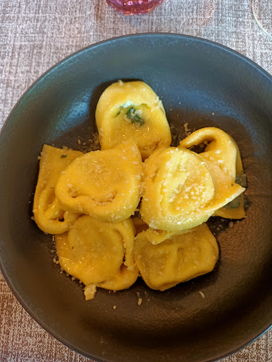 Pasta buons. Ho provato due primi, tortelloni burro e salvia (in foto) e tortellini in brodo. Tra i due ho gradito molto i tortellini in brodo che riprenderei. I tortelloni -comunque buoni anche se un po' scotti- erano scomodi da mangiare perché messi in un piatto molto fondo che -seppur bellissimo- era poco funzionale per il tipo di pasta.