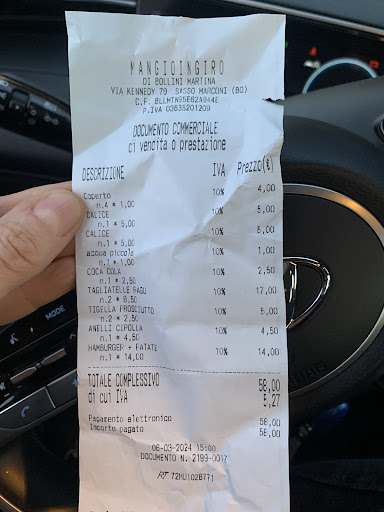 Read moreSiamo stati oggi a mangiare a pranzo perché eravamo sulla strada per degli affari, mentre stavamo mangiando il locale aveva avuto un controllo da parte della Finanza. Abbiamo mangiato delle tagliatelle con ragù, delle tigelle, degli anelli di cipolla e tutto questo era passabile. Mia figlia ha ordinato un hamburger di Angus che faceva letteralmente schifo. il cameriere si è accorto che io lo stavo annusando ripetutamente per cui si è avvicinato chiedendomi cosa non andasse e gli ho chiesto se l’hamburger era andato a male. È uscita la cuoca credo o la Titolare non so, chiedendomi se conoscevo la carne di Angus. Mi veniva da ridere. Io che avevo costretto mia figlia a mangiarlo quando l’ho usato le ho detto di lasciarlo lì. Non so cosa ci fosse che non andava ma quello non era Angus oppure era andato a male o era stato conservato vicino a qualche altro cibo dal quale aveva preso l’odore. Per scusarsi ci hanno offerto due caffè. Non ci tornerei mai più, soprattutto perché quando gliel’ho fatto presente il cameriere era scocciato, anche al momento di pagare il conto si vedeva che sembrava offeso.
