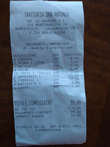 Read moreUn'esperienza indimenticabile alla Trattoria San Antonio! La Trattoria San Antonio a Savignano sul Panaro è stata una scoperta fantastica, un vero gioiello che consiglio a chiunque si trovi in zona. Fin dal primo momento, siamo stati accolti da un personale educatissimo e attento, che ci ha fatti sentire subito a nostro agio. L'esperienza culinaria è iniziata con un antipasto della casa a dir poco squisito: un trionfo di affettati freschi, gnocco fritto, crescentine fragranti e sottaceti misti, il tutto accompagnato da deliziosi strigoli all'aglio. Un inizio perfetto che ha stuzzicato il palato in modo eccellente. Come primo, la gramigna con salsiccia era cotta alla perfezione e ricca di sapore, un vero comfort food che ha pienamente soddisfatto le aspettative. Ma il pezzo forte è stato l'arrosto di carne mista: tenero, succulento e cotto alla perfezione, accompagnato da una fresca insalata mista. Ogni boccone era un piacere! E non possiamo non menzionare la magica terrazza: pranzare qui, con la vista panoramica su tutta la città, ha reso l'atmosfera davvero unica e indimenticabile. Un altro dettaglio che fa la differenza: i bagni erano pulitissimi e forniti di tutto l'occorrente, un segno di grande attenzione per il cliente. E per finire in bellezza, prima del conto ci è stato offerto un ottimo digestivo a scelta tra nocino e limoncello della casa. La Trattoria San Antonio merita senza dubbio le sue cinque stelle. Un luogo dove la qualità del cibo, l'eccellenza del servizio e la bellezza della location si fondono per creare un'esperienza culinaria davvero superlativa. Ci tornerò...
