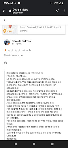 Read morenon ci torno più, sono dei maleducati. ok l'ampia gamma di birre e il buon cibo ma se ti trattano male preferisco andare al bar di fronte. con il locale vuoto ho aspettato davanti al bancone oltre cinque minuti per essere servito, ho chiesto consiglio su una birra con una buona gradazione alcolica e che non fosse troppo aromatizzata e mi è stato risposto che la lavagna con l'elenco delle birre era già abbastanza esplicativa (ci sono scritti solo i nomi delle birre e la gradazione alcolica) stavo cercando una birra che sapesse da birra e non da ciliegia o caffe o un altro mescolone assurdo che niente ha a che fare con la birra. nel consigliarmi sono stati maleducati e altezzosi trattandomi da ignorante e la cosa è peggiorata quando gli ho detto che dovevo andare e mi serviva in un bicchiere di plastica da portare via. ho dovuto insistere e hanno sbuffato e mi hanno detto che la loro birra non può essere bevuta in un bicchiere di plastica. mi hanno comunque accontentato ma prendendomi in giro. sono di argenta e capita che i miei amici vadano li il venerdì sera, li convincerò a...