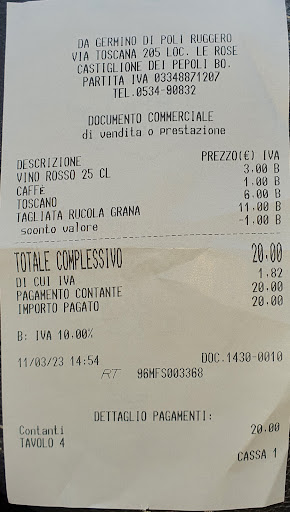 Sono un manager commerciale di una Società per Azioni abituato a viaggiare e ho sempre insegnato alle mie reti vendita che non esiste pubblicità migliore di quella del cliente pienamente soddisfatto... Viaggio di rientro da Cascina (PI) direzione S.Daniele del Friuli (UD), cartelli autostradali elettronici che segnalano un ingorgo per incidente sul bivio A1 A13 e a mettersi in coda proprio non ci penso. Sono in una posizione incantevole, immerso nel verde, tra i colli dell'appennino, dall'autostrada esco a Badia alla ricerca di un trattoria dove sentire il profumo delle valli toscane, il vino contadino insomma, un ambiente casereccio. Ecco la Trattoria da Germino di Poli Ruggero in località Le Rose, Castiglione dei Popoli... rustico, ruspante ma anche curato in una ambientazione meravigliosa tra la vegetazione boschiva, dall'ingresso si sente lo scroscio del ruscello che passa a pochi metri in caduta... profumi veri, profumi della terra contadina, della cucina della nonna. Bello l'ambiente interno, curato e pulito con dipinti stampati sulle pareti (vedi foto) che ti ricordano dove sei... come fossi a casa della nonna che non hai piu di cui peró, considerata l'ora ricordi specie le sue doti culinarie..! Inizio con un antipasto Toscano (vedi foto) semplice, saporito, profumato tipicamente locale con questi crostini rustici che ti invogliano a mangiarne uno dietro l'altro ed i salumi che ti catturano con quel profumo senza eguali eddio come lega con il Sangiovese rosso locale... che sapori..! Arriva il secondo (vedi foto)... tagliata di manzo rucola e grana, cotta ottimamente, morbida, per nulla asciutta, saporita, perfetta è l'aggettivo adatto...! Caffè macchiato caldo e via si riparte per la destinazione finale ma prima vorrei sottolineare qualcosa sul servizio e per esperienza non è così scontato... Carlotta è stata l'artefice del servizio di un pasto che resterà certamente nei miei migliori ricordi finché non tornerò da queste parti magari con i miei consulenti del Triveneto o con moglie e figlio... nonostante la sala piena, è stata veloce, chiara, esaustiva e in grado di rispondere a tutte le domande sulle pietanze che ho fatto e qui si vede chi lavora perché deve e chi lavora con passione. Grazie a tutti, in cucina, al servizio, a tutta la gente che c'era perché nonostante il mio arrivo alle 13.30 era ancora...