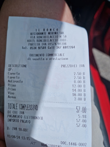 Buona giornata a tutti. SCONSIGLIO questo ristorante che costa TANTISSIMO per essere all'uscita dell'autostrada. Ma io dico, si può fare un'uscita autostradale che passa per un'area di servizio? Beh, se uscite a Roncobilaccio dovete uscire per l'area di servizio!!! Vabbè, assurdo. Ma più assurdo andare al ristorante il Ronco. Chi ha già letto mie recensioni sa che scrivo il vero. Mi dispiace molto perché ci lavorano persone che magari campano con quel lavoro (parlo del personale non dei proprietari o gestori). Il bello, direi meglio, il brutto è che questa gente è ottusa. Non capisce che far mangiare bene e spendere il giusto (non ho scritto poco) è un'arma, soprattutto nella ristorazione, che ha un sacco di ritorno. ...ma che scrivo, questi non hanno neanche un sito, è chiaro che stanno indietro! Non voglio entrare nello specifico. Posso e devo, per onor del vero, dire che si mangia abbastanza bene. Quando hanno battuto il conto, pensavo tra me e me, forse c'è un errore. Non ho detto niente perché non mi va di fare discussioni se neanche sono sicuro di quello che dico. Ci sono rimasto di un male!! Sapete, quando in autostrada dite: Fermiamoci per mangiare qualcosina che ne so, un antipastino e un primo, un bicchiere di vino, un caffè senza spendere troppo e si riparte? Beh, pensateci bene...all'uscita c'è anche...