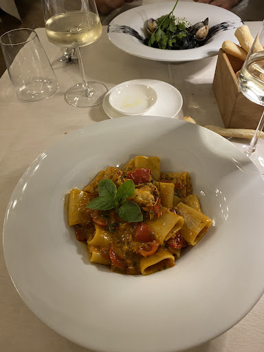 In 2 per una cena. Il cibo ottimo, anche il vino. La cosa che ho notato inizialmente è che da parte del personale in sala non abbiamo ricevuto la giusta accoglienza. Ci siamo seduti a tavola, abbiamo ricevuto l’acqua, ma per avere il menù abbiamo atteso 25 minuti circa. Inizialmente abbiamo prenotato tramite il sito ufficiale, facendo la scelta della degustazione a 49€ a testa, poi però, abbiamo cambiato idea arrivati sul posto chiedendo se gentilmente potevamo ordinare normalmente alla carta in maniera diversa. (Richiesta eseguita dopo i 25 minuti di attesa). Anche per l’ordinazione abbiamo atteso un po’. Dopo la richiesta dell’arrivo dei menù, cosi da poter scegliere cosa mangiare, volevamo ordinare anche del vino, ma non ci era stata portata la carta dei vini, e l’ho dovuta chiedere durante l’ordinazione. Ci tengo a precisare ciò che mi è saltato all’occhio; dopo esserci seduti, sono arrivati altri due tavoli di seguito, subito hanno avuto il menù del mangiare e la carta dei vini, e hanno ordinato anche prima di noi. Non voglio creare polemiche, semplicemente, visto il modo di fare iniziale, non ci siamo sentiti i “benvenuti”, al contrario abbiamo dovuto chiedere noi per ordinazione ed altro, dopo che varie volte il personale di sala è passato davanti a noi vedendo anche solo il fatto che non avevamo un menù a tavola. A seguito dell’ordinazione vasta e della bottiglia di vino, l’atteggiamento è cambiato in maniera evidente. Non vorrei essermi creata l’idea sbagliata in testa, però mi sembra che ci si sia basato molto sulle prime...
