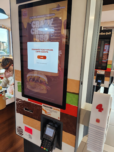 Modifico la mia recensione portandola da tre stelle a due, se non fosse per il cibo che è di buona qualitá e i panini sono buoni, avrei dato una stella. Sto benedetto ghiaccio che manca da una vita, cosa aspettate a sistemare la macchina? Volevo ordinare tramite app e l'app non funzionava nella sezione del pagamento, ordino dal totem e non funziona il lettore QR code per la lettura dell'app, ordino comunque dal totem e non esce lo scontrino, prendo dell'acqua e l'acqua era calda come fosse stata sotto il sole. Il posto è anche carino ma la gente che ci lavora secondo me si deve dare una svegliata e tanto anche, perché nel momento in cui sono stato al tavolo ho visto molte persone lamentarsi di mancanze o altro. Supervisori fate un salto nel punto vendita!!! io apprezzo Burger King e vengo sempre, ma se continua cosí probabilmente rifaccio un salto...