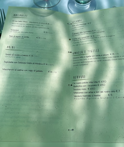 Suona di presa in giro Si arriva in questo luogo appartato sperando di trovare una sintesi di cucina del territorio e innovazione. Ma l’apparenza inganna, e tanto. Il cibo è discreto, bisogna essere onesti. Ma tutto il resto proprio non funziona. I piatti effettivamente sono quelli della tradizione, l’innovazione si limita però purtroppo alla semplice aggiunta di qualche aroma/erbetta e alla drastica riduzione delle porzioni. Purtroppo tutto sembra finalizzato ad aumentare il profitto: la richiesta di un po’ di aceto da aggiungere all’insalata, dove peraltro mancava, ha provocato il supplemento di 0,50 €. Per di più era banalissimo aceto anche non di grande qualità. Siamo nella patria dell’aceto balsamico, come vi risuona? Ma chiaramente servito in un’ampolla di vetro con cerimoniale annesso!! Il servizio era a dir poco catastrofico. I due camerieri, bizzarri sia in abbigliamento che in attitudine, non sanno proprio gestire le basi della ristorazione. Siamo arrivati alle ore 12:15, c’era solo un altro tavolo occupato da tre persone vicino a noi. Alle 12.45 abbiamo finalmente potuto ordinare e le prime pietanze sono arrivate alle ore 13:30. Avendo richiesto come primo gnocco fritto e contorni la poco gentile cameriera si è anche rifiutata di portarci del pane. Ma il coperto è stato fatturato! E dopo un’attesa simile hanno anche speculato sul numero degli gnocchi, contandoli e specificando a chiare lettere a quanti gnocchi avevano diritto i commensali. Neanche fossero tartufi! Mi sembra una tristezza infinita per la gastronomia emiliana. Le porzioni dei secondi, in analogia ai primi, erano pure ridicole. Il conto meno. Se avete voglia di farvi abbagliare dalle elucubrazioni fantasiose del cameriere con le calze a strisce e i pantaloni clowneschi e avete tempo e soldi da buttare questo è il posto per voi. Alla fine potete anche godere delle battute sarcastiche...