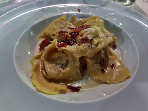 Read moreRistorante pizzeria molto alla mano, un grande parcheggio ma l'interno proprio non l'ho visto. Quando ci sono stato la sera c'era tanta gente e noi eravamo in 30. Per fortuna c'era un amico che ha prenotato in quanto del posto... Ed è stata una bella fortuna perché nessuno avrebbe avuto mai un'impressione del genere. Servizio veloce e cortesia sempre. Abbiamo preso 2 primi (ne avrei voluto 3 ma i miei amici si sono voluti fermare. Delle fettuccine con funghi porcini e speck decisamente meravigliose ed una porzione di ravioloni ripieni di carne fatti con gorgonzola, pere e speck. In entrambi i casi lo speck era croccante al punto giusto. Le fettuccine per tutti da urlo mentre i ravioloni sono piaciuti ad alcune persone si ed altre no in quanto si sentiva il sapore dolciastro delle pere. Per quanto mi riguarda entrambi i piatti erano impressionanti. Come antipasto abbiamo preso delle pizze margherite... Come detto matti... Quali siamo. Se siete da quelle parti...