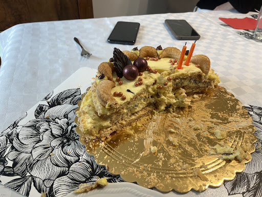 Invece della corona d’alloro realizzata con la sac à poche, come da foto mostrata, ci è stata consegnata una decorazione che ricordava una ghirlanda natalizia in zucchero, del tutto inappropriata per il contesto. Ancora più inaccettabile è stata la scritta, realizzata in modo approssimativo e inquietante, che ha compromesso ulteriormente l’aspetto della torta.