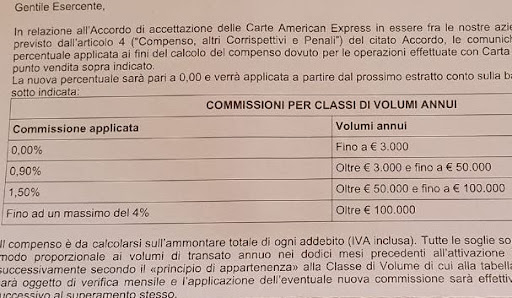 Rispondo al gentile riscontro. Esistono pos gratuiti e senza costi fissi che si fanno pagare una commissione fissa (il più noto, che possiede ogni kebabbaro, è Sumup, che applica 1.95%). Inoltre, penso che sarebbe lieto di pagare fino ad un massimo del 4% ad American Express, visto che tale commissione è solo per il surplus di 100.000 euro. Del resto, si paga 0 sino a 3.000 euro, lo 0.90% sino a 50.000, 1.5% sino a 100.000. Confronti con il POS della sua attuale banca e non mi stupirei se pagasse di più. Le allego le condizioni standard (PS. Non lavoro per Amex, sia chiaro, ma semplicemente sono a conoscenza della cattivissima informazione che circola tra...