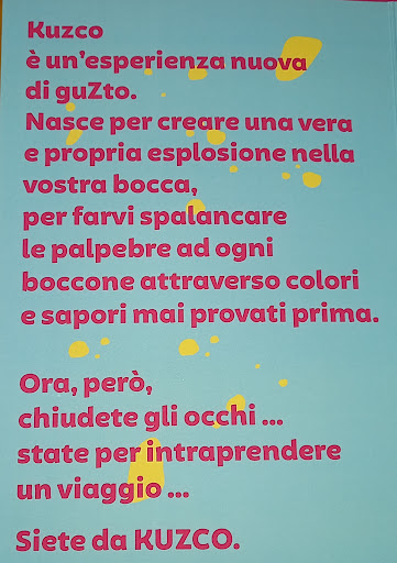 Nel mondo del pesce crudo, dominato da sushi e poke, Kuzco è una ventata di aria fresca! Personale giovane al comando, l'entusiasmo non gli manca. La qualità è eccellente e i sapori sono davvero da provare. Peccato che il menù debba ancora trovare una sua forma definitiva. I piatti infatti sono a base esclusiva di pesce, manca un accompagnamento che completi il pasto. Speravo in un po' di riso, una tortilla, un fritto croccante... Invece non è possibile nemmeno ordinarne a parte. Davvero un peccato perché spendere 15 euro per un piatto da asporto e non ottenere un pasto completo fa risultare il tutto troppo caro. Consiglio comunque di andarci per provare i sapori (però portatevi i...