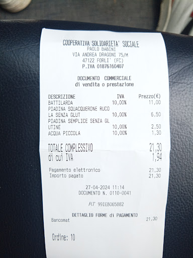 Read moreOttima piadineria a partire dalla qualità e dalla vasta scelta nel menù,con proposte vegane sia nelle piadine, che negli hamburger, hanno anche tante birre per tutti i gusti, pure i prezzi sono giusti per la qualità che offrono quindi direi che tutte le stelle sono guadagnate. Da aggiungere la location,con tanti tavoli al coperto, poi di trova all'interno del parco, molto bello per chi vuole fare sport, per chi si vuole rilassare o per chi vuole solo godersi l'aria aperta, se per caso avete bisogno dell'acqua da bere per casa loro hanno le tessere per l'erogatore all'ingresso, costo 5 euro, ma nella tessera ci trovi 5 euro di credito,...