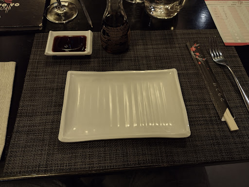 Ci sediamo e ordiniamo. Poco dopo malgrado la sala fosse piena arrivano i primi piatti, entusiasti mangiamo e sui nigiri il riso era caldo! Però vedo il lato positivo! Riso caldo vuol dire appena preparato, per cui tutto il resto sarà ottimo! Nulla di più sbagliato in quanto QUELLO sarà l'unico piatto caldo della serata! TUTTI I FRITTI SERVITI FREDDI, MOLLI E ASCIUTTI. Perfino i pezzi col pesce COTTO erano FREDDI! "Riso speciale" cioè riso venere, insapore solo l'acido della maionese si sentiva. Passiamo ai "limiti" si signori avete letto bene, il sashimi si può ordinare una volta a testa e non è l'unico piatto ad avere questo limite. Parliamo un secondo di come si presentano i piatti: Mai visto zenzero, wasabi e nessuna sorta di abbellimento. Salsa teriachi a parte, ma servita sui piatti rigorosamente neri. Va bene il minimal ma siamo un po' all'eccesso direi.