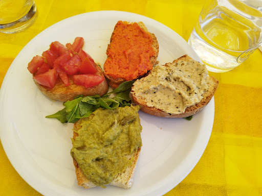 Pessimo... non lo consiglio. Localino con posti all'aperto, con cucina difronte al bagno, neanche un granché pulito. Se avete tempo leggete tutto. Ci siamo fermati per pranzo. Dopo aver portato la classica bottiglia d'acqua non richiesta, ha preso l'ordine. Eravamo il terzo tavolo in ordine di arrivo, ci hanno portato un piattino di bruschette, mentre noi ne abbiamo chiesto 2, chiamata la cameriera ci informa che sarebbero arrivate con la seconda portata. Intanto i tavoli si erano riempiti tutti. Sembrava, ripeto, sembrava un posto con un servizio veloce, tanto che al tavolo prima del nostro era stato servito l'antipasto e le tagliatelle al ragù insieme. abbiamo fatto anche la battuta sul fatto che le tagliatelle si sarebbero incolla, ok. Poi ci siamo accorti che tutti stavano mangiando e solo il nostro tavolo non veniva servito. Ho chiesto il perché, la cameriera ha risposto che servivano in base all'ordine di arrivo. Le ho fatto presente che noi eravamo lì prima di altri e lei ha risposto che noi avevamo avuto le bruschette (1 su 2 le ho precisato) e non potevamo mangiare solo noi. E che comunque si servivano prima gli antipasti e poi i primi, Le ho fatto notare che il tagliere di formaggi e le bruschette erano inseriti negli antipasti e che comunque non erano arrivati, ed eravamo gli unici a non mangiare. E che a questo punto poteva portare il conto e saremmo andati altrove. Abbastanza infastidita è rientrata ed è arrivata con il mio tagliere e me lo ha volontariamente rovesciato per metà addosso, era impossibile un incidente, infatti mi ha rovesciato solo la parte con miele e salse. Rovinando il vestito, mi sono lamentata vigorosamente, dopo essermi ripulita un po' non ho voluto più pranzare. Nonostante tutto mi è stato presentato il conto. Che ho pagato anche senza mangiare, con il vestito appiccicoso, potevo rifiutarmi e chiedere il conto della lavanderia, non è mia abitudine non pagare...ma posso lasciare il riassunto della mia disavventura e non consigliarlo assolutamente. Vi posto la foto dell'unica cosa che è arrivata e non ho neanche mangiato in...