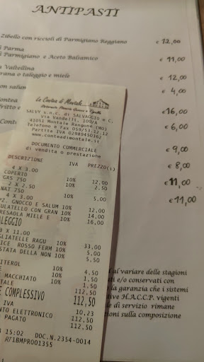 Allora io rientro per verificare se ricordavamo bene le cifre nei menu e vicino all'ingresso trovo una montagna di menu, e sembrano tutti identici a quelli con cui abbiamo ordinato, i dubbi sono confermati, subito riesco a vedere che il mio culatello doveva costare 12 e lo scontrino dice 14€ La bresaola con miele e taleggio doveva costare 12 e invece lo scontrino dice 16€ Gnocchi con salumi ne avevamo presi 2 (tot 8€) e invece lo scontrino riporta 3 per 12€ Calice di vino doveva essere 3,5€ ma lo scontrino ne riporta 5€